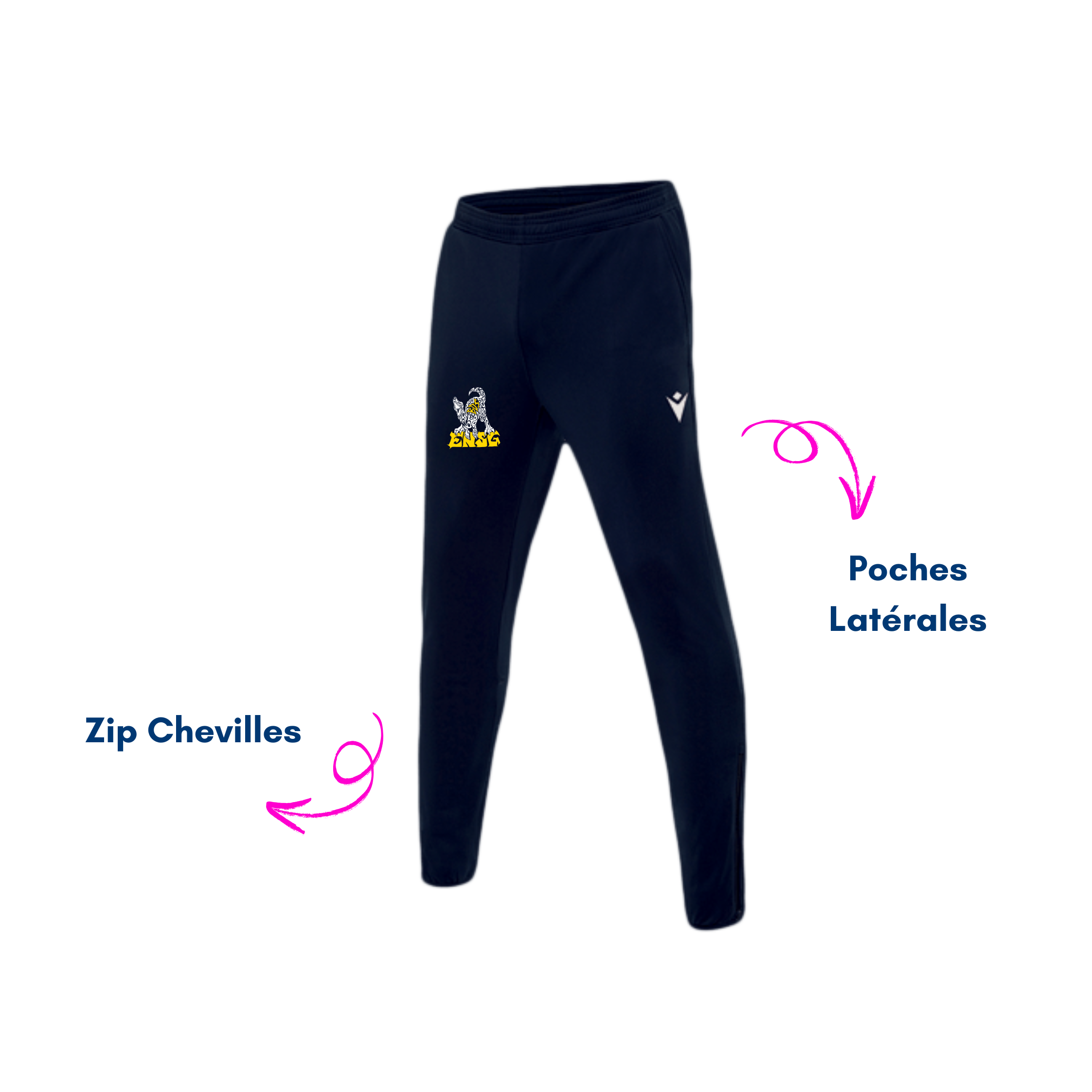 de Macron conçu par le BDS de l’ENSG Nancy. Le jogging est personnalisée avec le logo du bureau sur la cuisse. Il est conçu est une coupe ajustée et des zips aux chevilles.