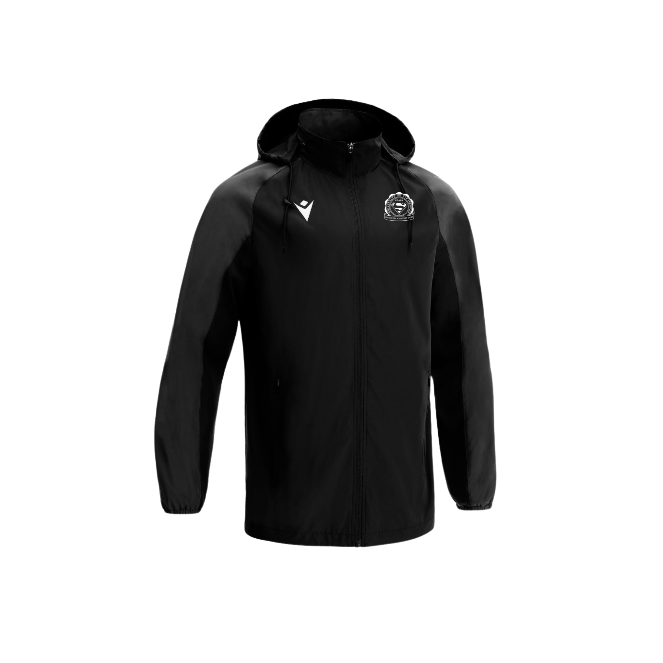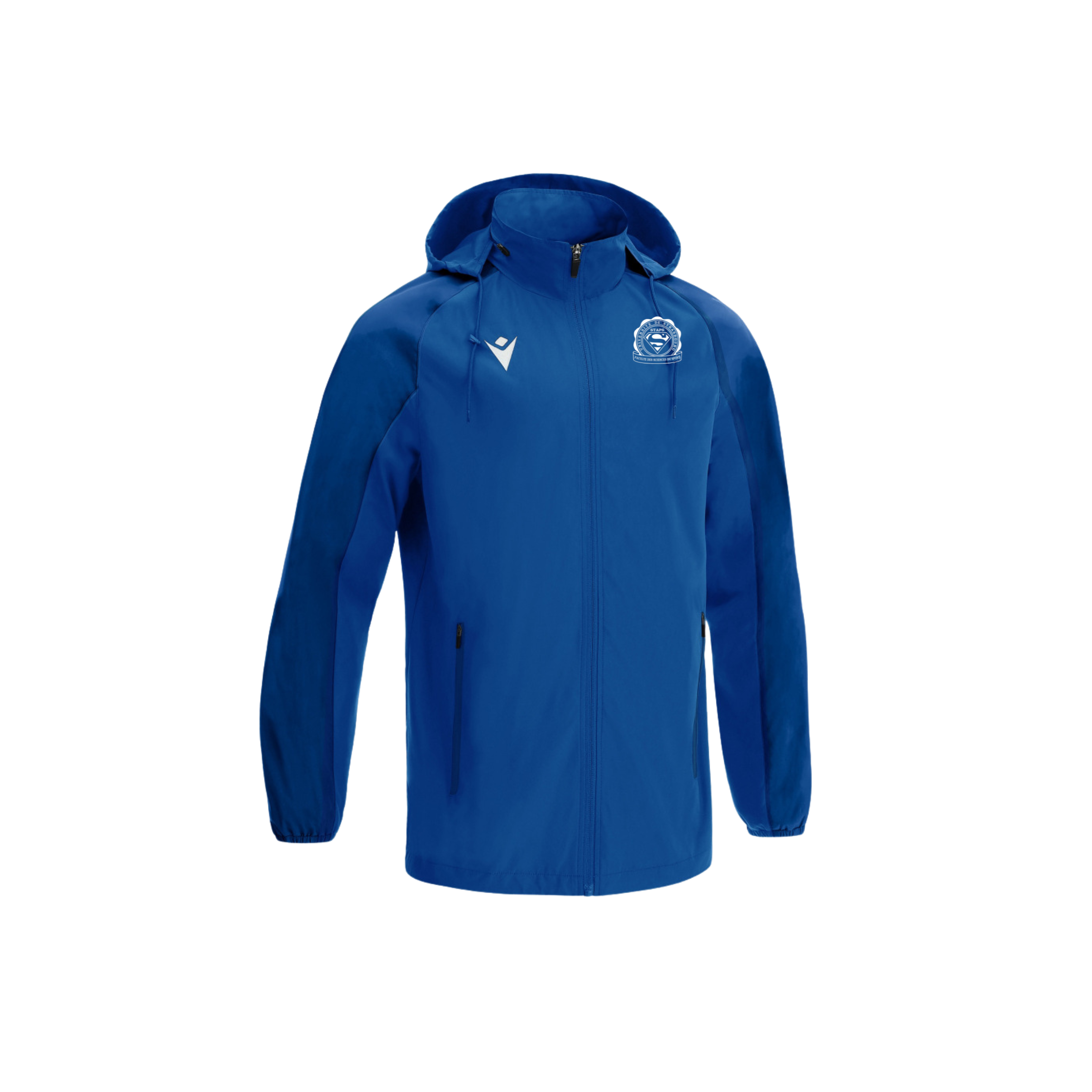 Macron conçue par le BDE STAPS Strasbourg et Epopey. La veste est personnalisée avec le logo du BDE sur la poitrine.